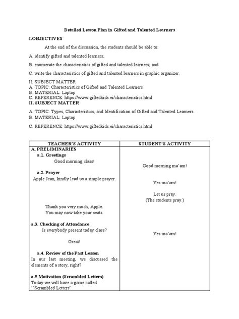 Free PDF GIFTED AND TALENTED FIRST GRADE LESSON PLAN rtf